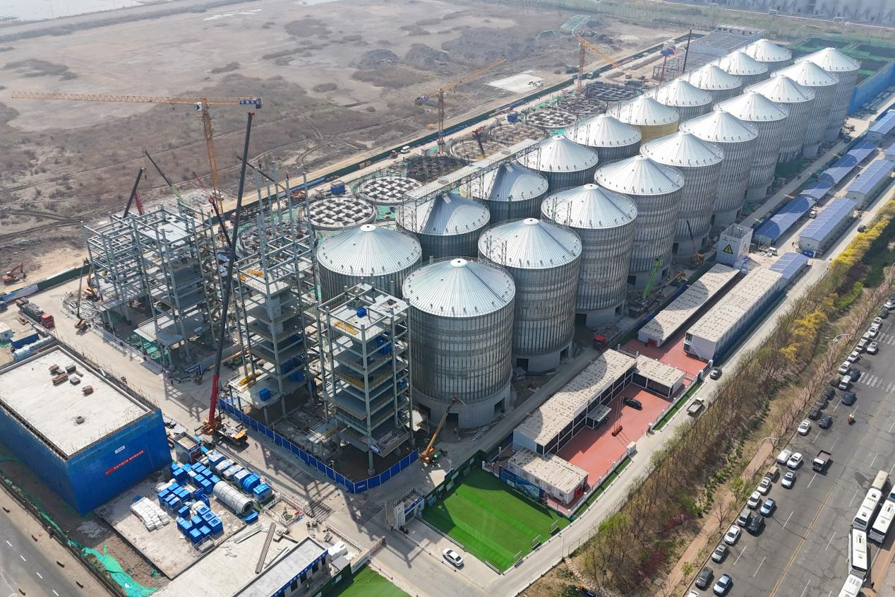 中冶天工临港当代粮食品流财产园区粮食仓储物流集散中央项目20座钢筒仓主体 ...