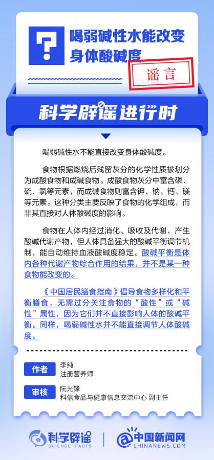 中新网10月12日电 喝弱碱性水不能直接改变身材酸碱度。食品根据燃烧后残留灰分的化学性子被分别为成酸食品和成碱食品。成酸食品灰分中富含磷、硫、氯等元素,而成碱食品则富含钾、钠、钙、镁等元素。这种分类重要反映了食品的化学构成,而非其直接对人体酸碱度的影响。食品在人体内颠末消化、吸取及代谢,产生酸碱代谢产物,但人体具备强盛的酸碱均衡调治机制,能主动维持血液酸碱度稳固。酸碱均衡是体内各种代谢产物综互助用的效果,并不是某一种食品能改变的。(泉源:@科学辟谣 中国消息网微博) ![]() 【编辑:曹子健】 |