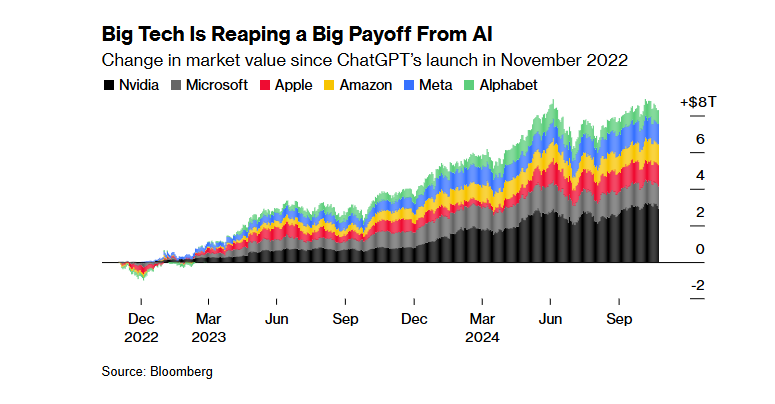 自ChatGPT推出以来,环球市值最高的六家科技公司总市值增长凌驾8万亿美元,三大重要云服务提供商的年收入突破2500亿美元大关。