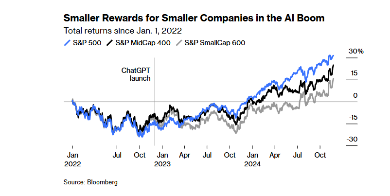 自ChatGPT发布以来,科技板块推动了尺度普尔500指数上涨达30%,而小盘股的回报率则相对暖和,仅为15%。值得留意的是,在ChatGPT推出之前的20年里,中小型企业的市场体现不停优于大型企业。