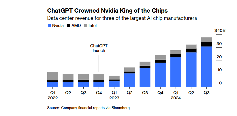 图注3:三大人工智能芯片制造商的数据中央业务收入,英伟告竣为芯片之王