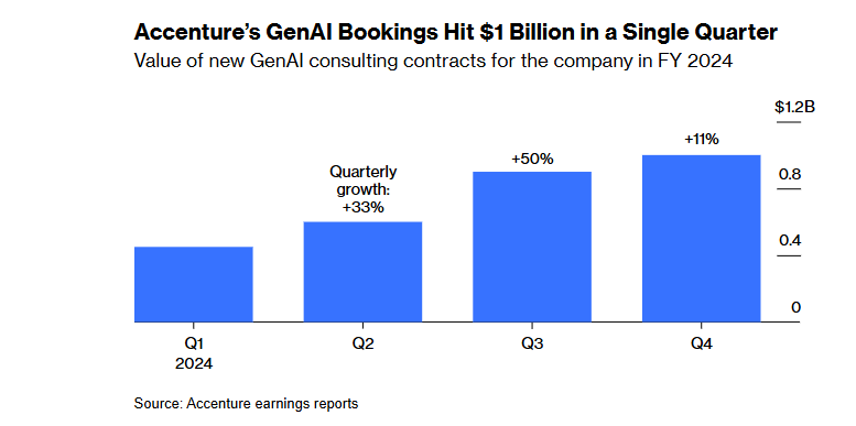 咨询巨头们在这场淘金热中饰演了紧张脚色,他们犹如谋利者手中的镐和铲子。据报道,麦肯锡公司本年约有40%的业务与天生式人工智能精密相干,而IBM的天生式人工智能业务在本年早些时间更是跃升至30亿美元。埃森哲的天生式人工智能预订量也出现出惊人的增长态势,从2023年末了六个月的3亿美元,飙升至2024年末了一个季度的10亿美元。