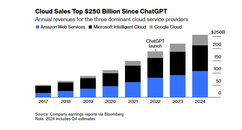别的,微软、亚马逊和谷歌等科技巨头的云业务收入也在加快增长。自ChatGPT发布以来,这三大重要云服务提供商的年收入已经突破了2500亿美元大关。