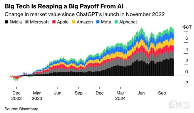 智东西 智东西12月2日消息,根据彭博社报道,停止2024年11月30日,OpenAI旗下谈天呆板人ChatGPT已推出整整两年。发布之初,OpenAI的工作职员曾押注ChatGPT会积聚多少用户,最大胆的预估用户数是10万人。 究竟是,已往两年,在环球瞩目下,ChatGPT在两个月内得到了1亿注册用户,逾越外洋版抖音TikTok,成为汗青上用户增长速率最快的消耗级应用步伐;现在,ChatGPT在环球拥有约2亿活泼用户。 据彭博社统计,在由ChatGPT掀起的天生式AI高潮下,美国最大的六家科技公司,其市值总额在两年间增长超8万亿美元(约合人民币58万亿元),AI芯片制造商、云服务提供商、咨询公司这些卖铲子和卖镐头的人赚得盆满钵满。 一、大、中、小型公司市值增长存在巨大差距 在ChatGPT推出后的两年间,美国最大的六家科技公司——英伟达(Nvidia)、微软(Microsoft)、苹果(Apple)、亚马逊(Amazon)、Meta、谷歌母公司Alphabet,其市值总额增长8.3万亿美元。 此中,“卖铲子”的英伟达市值增长最为显着,2022年11月30日至2024年11月25日,其市值增长了2.9万亿美元,涨幅超700%;Alphabet的增长绝对值最小,为7527亿美元,涨幅约66%。