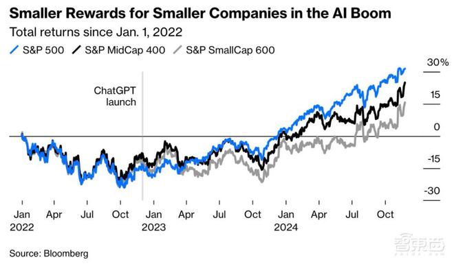 ▲2022年11月ChatGPT推出之后六大科技公司市值变革(图源:彭博社) 中小型公司仅得到了较小的回报。2022年1月3日至2024年11月25日的统计周期内,科技板块推动尺度普尔500指数(S&P 500,简称为“标普500”)上涨了超30%,而小型股600指数(S&P SmallCap 600)的涨幅为15.6%,中型股400指数(S&P MidCap 400)的涨幅为24.9%。