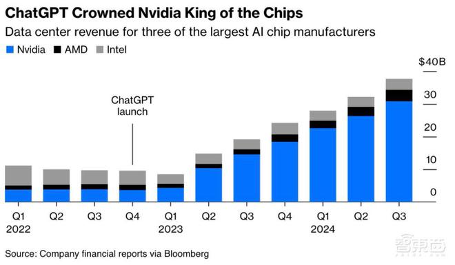 ▲2022年11月以来的市场总回报(图源:彭博社) 二、卖铲子和卖镐头的人赚得盆满钵满 两年间,AI芯片制造商的市场格局也发生了变革。 ChatGPT推出次年的第一季度,英伟达数据中央收入逾越英特尔(Intel),并在接下来的六个季度连续走高,和英特尔之间的差距越拉越大。2024年第三季度,英伟达数据中央收入为308亿美元,是两年前的八倍;同期英特尔数据中央收入从2022年第三季度的43亿美元,下滑至2024年第三季度的33亿美元,降幅约23.26%。