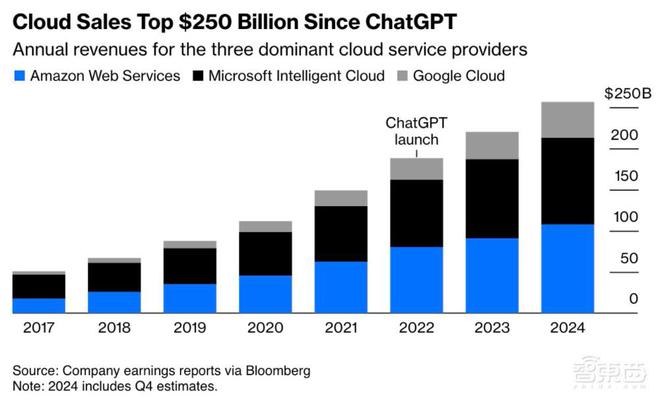 ▲三大AI芯片制造商的数据中央收入(图源:彭博社) 微软、亚马逊(AWS)、谷歌的云服务收入也在已往两年间加快增长,2024年这三大云服务提供商的年收入总额已达2560亿美元,两年增长超36%。