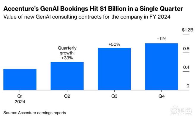 ▲三家重要云服务商的年收入(图源:彭博社) 彭博社将咨询巨头形容为这场淘金热中的“镐头和铲子小贩”。据《纽约时报》报道,麦肯锡本年约40%的业务与天生式AI相干,IBM的天生式AI业务收入已到达30亿美元。别的,埃森哲的天生式AI条约金额总数从2023年下半年的3亿美元,飙升至2024年第四序度的10亿美元。