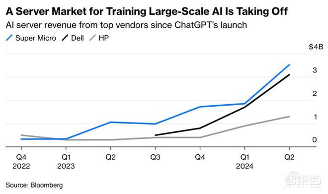 ▲2024财年埃森哲的天生式AI相干条约金额(图源:彭博社) 用于练习大规模AI的服务器市场也正在腾飞。自ChatGPT推出以来,尤其是2023年第二季度开始,美国超微(Super Micro)、戴尔(Dell)、惠普(HP)的服务器收入得到了显着的增长。此中,超微AI服务器收入从2022年第四序度的约3.32亿美元,涨到了2024年第二季度的35亿美元,涨幅高达954%。