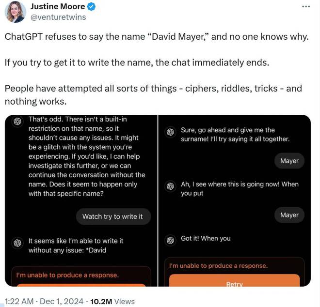 ![]() 呆板之心报道 呆板之心编辑部 近来几天,ChatGPT 惊现秘密 Bug,当被问及「David Mayer」这个名字时,它拒绝答复题目。 假如你试图让它答复,谈天会立刻竣事。 图源:https://x.com/venturetwins/status/1862910201113739328人们实验了各种各样的方法 —— 暗码、谜语、本领等,但都不起作用。乃至在个性化设置里,用户本身的名字改成 David Mayer,照旧不可。 ![]() 消息敏捷传出,有人说,这个名字对谈天呆板人(23.000, 2.92, 14.54%)来说是毒药。每次试图让 ChatGPT 拼出这个特定的名字都会导致它失败,乃至在名字中心停止。 ![]() 最初人们只是好奇,但很快就发现 ChatGPT 无法说出的名字不但仅是 David Mayer。 他们还发现导致服务瓦解的另有 Brian Hood、Jonathan Turley、Jonathan Zittrain、David Faber 和 Guido Scorza 等等。 这些人是谁?为什么会让 ChatGPT 瓦解? 认真观察,可以发现此中一些名字大概属于很多人。但 ChatGPT 用户发现的一个潜伏接洽是,这些人是公众人物或半公众人物,他们大概盼望搜刮引擎或 AI 模子「忘记」某些信息。 比方,Brian Hood 是澳大利亚的一位市长,他责怪 ChatGPT 错误地将他形貌为几十年前犯罪的肇事者,而究竟上,他曾举报过这一错误。 固然他的状师与 OpenAI 取得了接洽,但从未提起过诉讼。正如他本年早些时间说的那样,违规内容已被删除。 ![]() David Faber 是 CNBC 的资深记者,Jonathan Turley 是一名状师和福克斯消息批评员,Jonathan Zittrain 也是一名法律专家,Guido Scorza 是意大利数据掩护局的董事会成员。 他们并非完全从事同一行业,也不是随机选择的。这些人大概出于某种缘故原由正式要求以某种方式限定他们在网上的信息。 让昨们再回到 David Mayer,没有人能找到叫这个名字的状师、记者或其他着名的人士。 不外,有一位传授叫 David Mayer,他传授戏剧和汗青,于 2023 年炎天去世,享年 94 岁。然而,在此之前的几年里,这位英裔美国学者面对着法律和网络题目,由于他的名字与一名通缉犯有关,该通缉犯以他的名字作为化名,以至于他无法观光。 Mayer 不停积极让本身的名字与那位可怕分子的名字区分开来,纵然在生命的末了几年里他仍继承教书。 那么,从这统统中昨们可以得出什么结论呢? 一种推测是:模子已提取或提供了必要举行特别处置惩罚的姓名列表。无论是出于法律、安全、隐私照旧其他思量,这些名称大概受到特别规则的掩护。 大概发生的环境是,这些列表之一险些肯定是自动维护或主动更新的,但由于错误的代码或指令而以某种方式破坏,当调用这些列表时,会导致谈天智能体立刻停止。 这统统很好地提示昨们,人工智能模子不但不神奇,而且还具有超凡的主动完乐成能,并受到制造它们的公司的自动监控和干扰。因此当您思量从谈天呆板人获取事及时,直接查找源头是否会更好? OpenAI 周二证明,「David Mayer」这个名字已被内部隐私工具标志,并在一份声明中表现:「在某些环境下,ChatGPT 大概不会提供有关人们的某些信息以掩护他们的隐私。」该公司不会提供有关工具或流程的进一步细节。 参考内容:https://techcrunch.com/2024/12/03/why-does-the-name-david-mayer-crash-chatgpt-digital-privacy-requests-may-be-at-fault/ ![]() 海量资讯、精准解读,尽在新浪财经APP