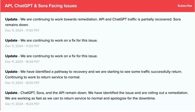 北京时间12月12日,OpenAI表现,API、ChatGPT和Sora流量已根本规复。“昨们正在监测局面,以确保全面办理宕机变乱。”