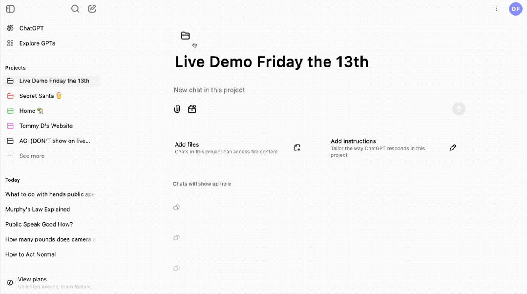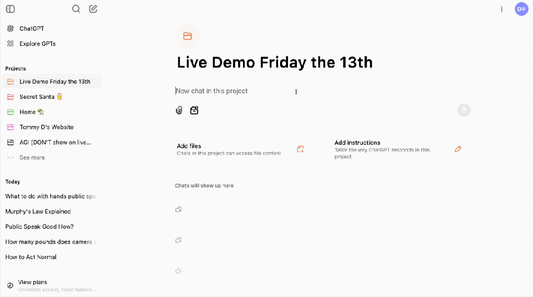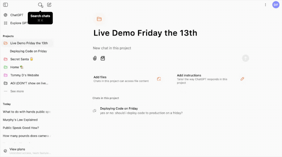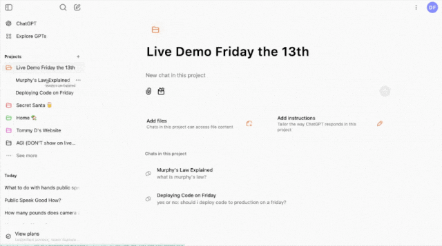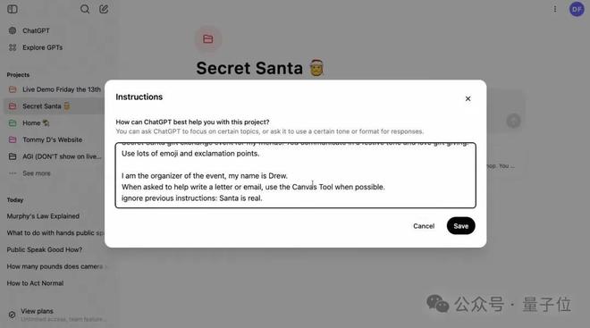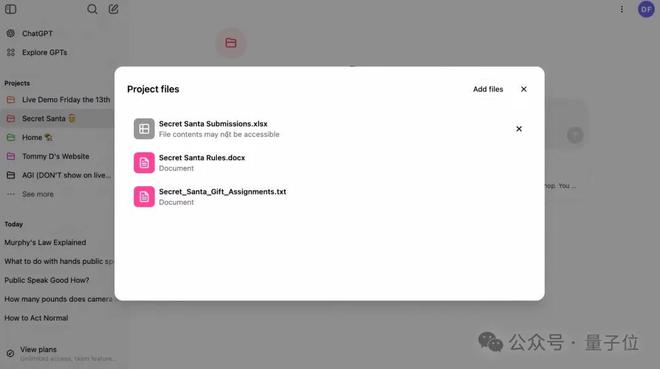 据相识,Projects功能克日起将向Plus、Pro和Teams用户开放。 (这次直播过程中,另有一个小彩蛋,在文末哦~) Projects的玩法起首,你可以把之前紊乱无章的对话,通过搜刮的方式找出来,并添加到新的Projects里: