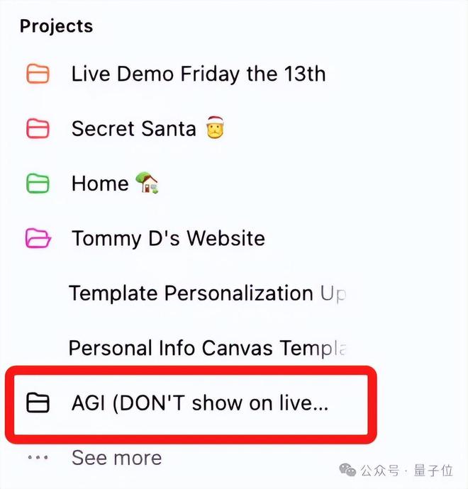 One More Thing在本日直播的过程中,眼尖的网友还发现了一个风趣的细节。 有一个Projects,名字竟然是“AGI(不要在直播中展示)”……