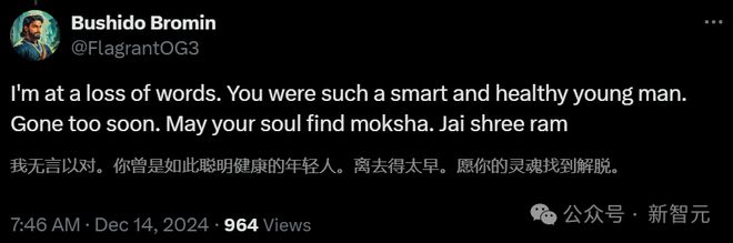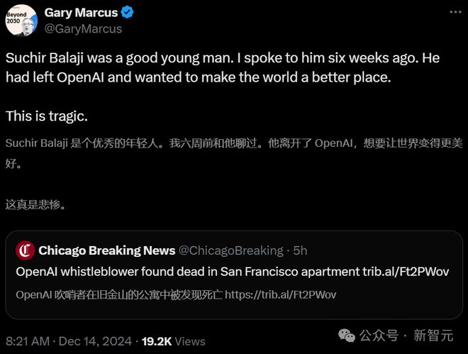 新智元报道 编辑:Aeneas 好困 【新智元导读】26岁的OpenAI吹哨人,在发出公开控告不到三个月,被发现死在本身的公寓中。法医认定,死由于自尽。那么,他在死前两个月发表的一篇博文中,都说了什么? 就在刚刚,消息曝出:OpenAI吹哨人,在家中离世。 曾在OpenAI工作四年,控告公司侵占版权的Suchir Balaji,上月尾在旧金山公寓中被发现殒命,年仅26岁。 旧金山警方表现,11月26日下战书1时许,他们接到了一通要求检察Balaji安危的电话,但在到达后却发现他已经殒命。