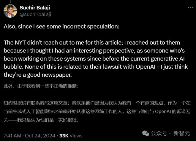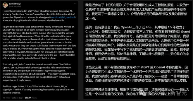 博文地点:https://suchir.net/fair_use.html 然而,就在公开控告OpenAI违背美国版权法三个月之后,他就离世了。