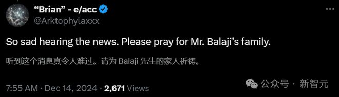 为什么11月尾的事变12月中旬才爆出来,网友们也表现质疑 实在,自从2022年底公开辟布ChatGPT以来,OpenAI就面对着来自作家、步伐员、记者等群体的一波又一波的诉讼潮。 他们以为,OpenAI非法利用本身受版权掩护的质料来练习AI模子,公司估值攀升至1500亿美元以上的果实,却本身独享。 本年10月23日,《纽约时报》发表了对Balaji的采访,他指出,OpenAI正在侵害那些数据被使用的企业和创业者的长处。 「假如你认同我的观点,你就必须脱离公司。这对整个互联网生态体系而言,都不是一个可连续的模式。」 一个抱负主义者之死 Balaji在加州长大,十几岁时,他发现了一则关于DeepMind让AI本身玩Atari游戏的报道,心生向往。 高中结业后的gap year,Balaji开始探索DeepMind背后的关键理念——神经网络数学体系。 Balaji本科就读于UC伯克利,主修盘算机科学。在大学期间,他信赖AI能为社会带来巨大益处,好比治愈疾病、延缓朽迈。在他看来,昨们可以创造某种科学家,来办理这类题目。