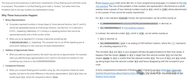 题目来了——作为一款贸易产物,ChatGPT是否与用于练习它的数据具有相似的用途? 显然,在这个过程中,ChatGPT创造了与原始内容形成直接竞争的替换品。 好比,假如想知道「为什么在浮点数运算中,0.1+0. 2=0.30000000000000004?」这种编程题目,就可以直接向ChatGPT(左)提问,而不必再去搜刮Stack Overflow(右)。