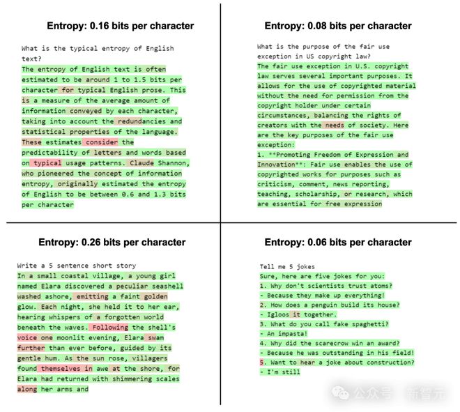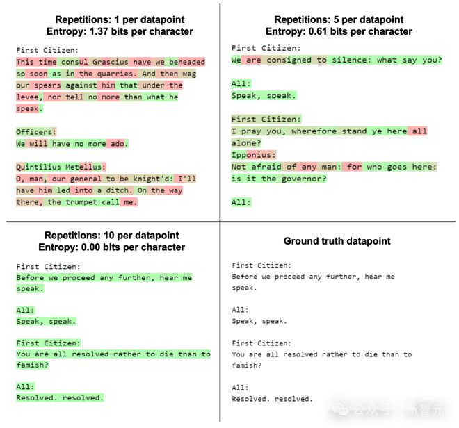 在实践中,盘算H(Y|X)——即已练习天生模子输出的信息熵——相对轻易。但要估算H(Y)——即在全部大概练习数据集上的模子输出总体信息熵——则极其困难。 至于H(X)——练习数据分布的真实信息熵——固然盘算困难但还是可行的。 可以作出一个公道假设:H(Y) ≥ H(X)。 这个假设是有依据的,由于完善拟合练习分布的天生模子会出现H(Y) = H(X)的特性,同样,过分拟合而且影象练习数据的模子也是云云。 而对于欠拟合的天生模子,大概会引入额外的噪声,导致H(Y) > H(X)。在H(Y) ≥ H(X)的条件下,就可以为RMI确定一个下限: 这个下限背后的根本原理是:输出的信息熵越低,就越大概包罗来自模子练习数据的信息。 在极度环境下,就会导致「内容重复输出」的题目,即模子会以确定性的方式,输出练习数据中的片断。 纵然在非确定性的输出中,练习数据的信息仍大概以某种水平被利用——这些信息大概被分散融入到整个输出内容中,而不是简朴的直接复制。 从理论上讲,模子输出的信息熵并不必要低于原始数据的真实信息熵,但在现实开辟中,模子开辟者每每倾向于选择让输出熵更低的练习和摆设方法。 这重要是由于,熵值高的输出在采样过程中会包罗更多随机性,轻易导致内容缺乏连贯性或产生虚伪信息,也就是「幻觉」。 怎样低落信息熵? 数据重复征象 在模子练习过程中,让模子多次打仗同一数据样本是一种很常见的做法。 但假如重复次数过多,模子就会完备地记下这些数据样本,并在输出时简朴地重复这些内容。 举个例子,昨们先在莎士比亚作品集的部门内容上对GPT-2举行微调。然后用差别颜色来区分每个token的信息熵值,此中赤色表现较高的随机性,绿色表现较高简直定性。