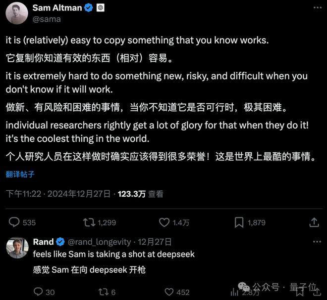 加之DeepSeek V3这次爆火的一个亮点,就是练习只花了557.6万美元的本钱。 于是乎,有人就开始猜疑了:它不会是在ChatGPT的输出底子上练习的吧? 好巧不巧,Altman也发了一个状态,好像在暗讽着什么……