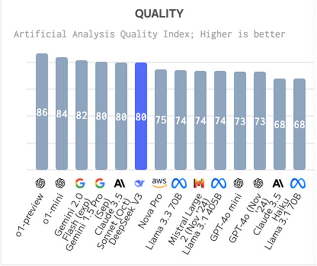 图片泉源:Artificial Anlaysis 速率:DeepSeek-V3比均匀速率慢,其输出速率为每秒87.5个Token。