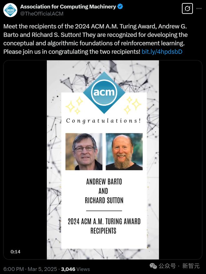 新智元报道 编辑:编辑部 HNZ 【新智元导读】强化学习之父Richard Sutton和他的导师Andrew Barto,得到了2024年图灵奖。有人说,图灵奖终于颁给了强化学习,这是迟到的「嘉奖」。 2024年图灵奖,颁给了强化学习之父! 就在刚刚,盘算机学会ACM公布:Andrew G. Barto和Richard S. Sutton为2024年ACM图灵奖得到者,以表扬他们为强化学习奠基了概念和算法底子。 继诺贝尔奖之后,AI学者再次将图灵奖收归囊中。