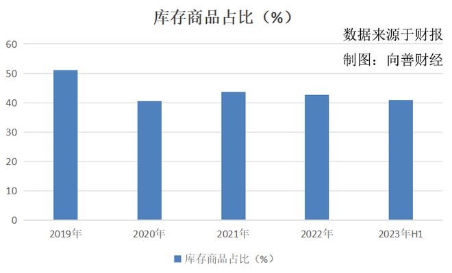 特别是自2019年以来,山西汾酒的库存商品规模便没有再低于过存货的40%,分别为51.14%、40.49%、43.66%、42.6%。直到2023年中报数据,山西汾酒该项占比仍高达40.96%。