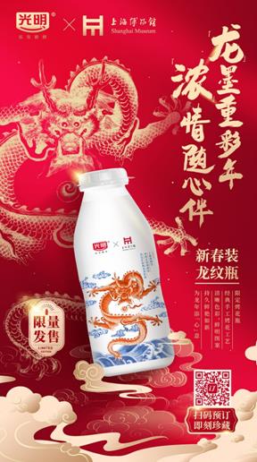 在龙年新春之际,光明乳业不仅冠名双卫视晚会,引领文化跨年营销新潮流,同时也在线下精心策划了新春送福利活动。为了庆祝这一特殊时刻,光明乳业特别开展了线上征集活动,挑选出2024名幸运消费者,并为他们送上了2024个限量款龙纹瓶。这款龙纹瓶是由光明乳业与上海博物馆联名打造的新春限量款新品,独特的设计将传统文化元素与品牌形象巧妙结合,为消费者带来了全新的视觉与口感体验。