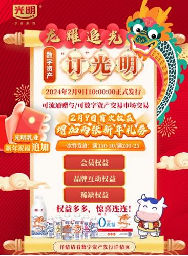 光明乳业在营销策略上展现出独特的眼光与魄力,不仅局限于常规的冠名与跨界合作,更选择了一条差异化的道路。2月9日,光明乳业联合上海数据交易所率先完成数字资产发行平台与数字资产交易平台的互通对接,正式发行全国可交易数字资产「龙耀追光· 一“订”光明」,这是光明乳业积极响应上海市人民政府办公厅发布的《立足数字经济新赛道 推动数据要素产业创新发展行动方案(2023-2025年)》,深入探索数字技术与实体经济融合之路上的又一成功案例。