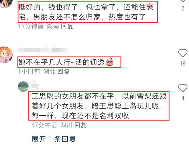 有网友表示小羽实在太高调了,一尝到点甜头就大肆秀恩爱,很难评。还有人觉得她长相普通、文化水平低下,方方面面都和王思聪的前任们没法比。