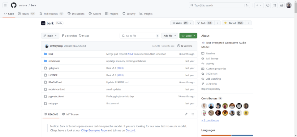 第一波是去年3、4月的时候,有一个很火的开源项目叫Bark,就是出自Suno之手,拿了将近32k的星标。