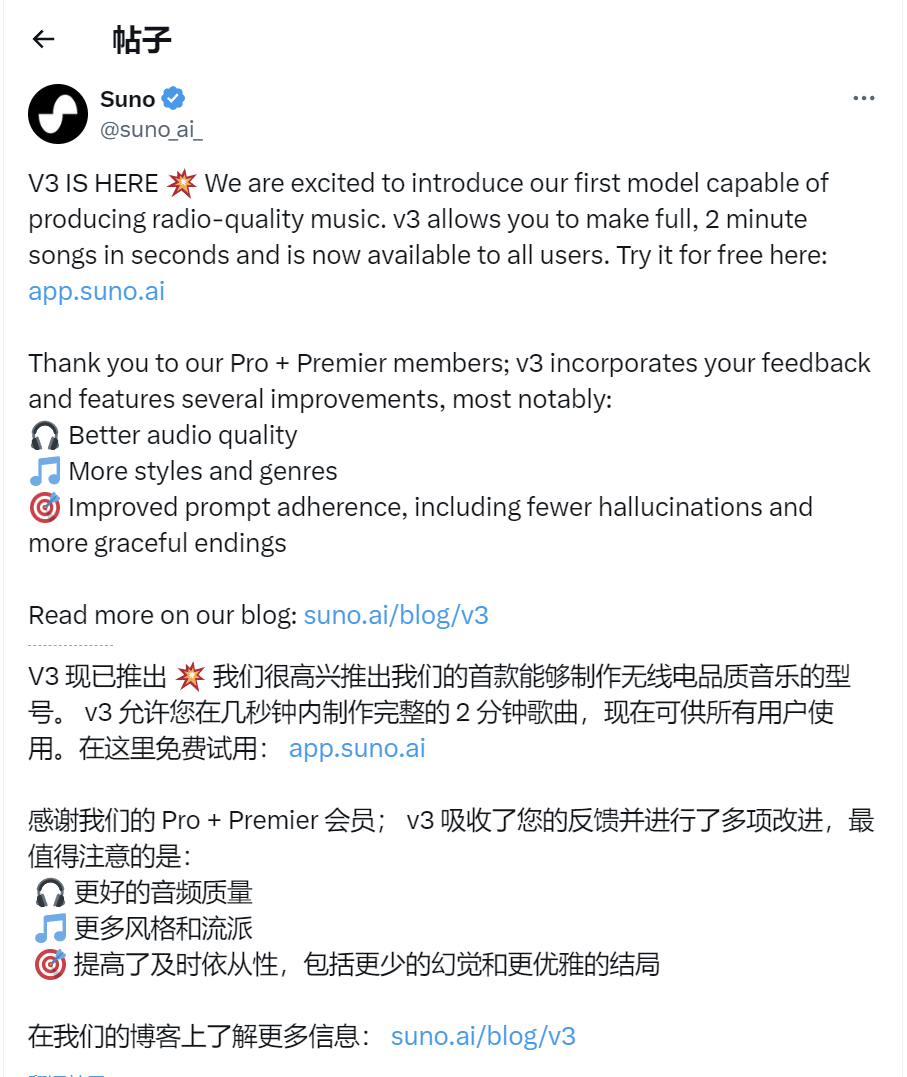 弊端就是Suno最多只能生成2分钟的音乐,所以可以听到最后,会戛然而止直接截断,但是已经比V2好很多了。
