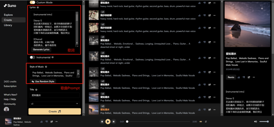 要生成音乐的话,第一步肯定是写prompt,第二步(纯音乐没有)就是写歌词。