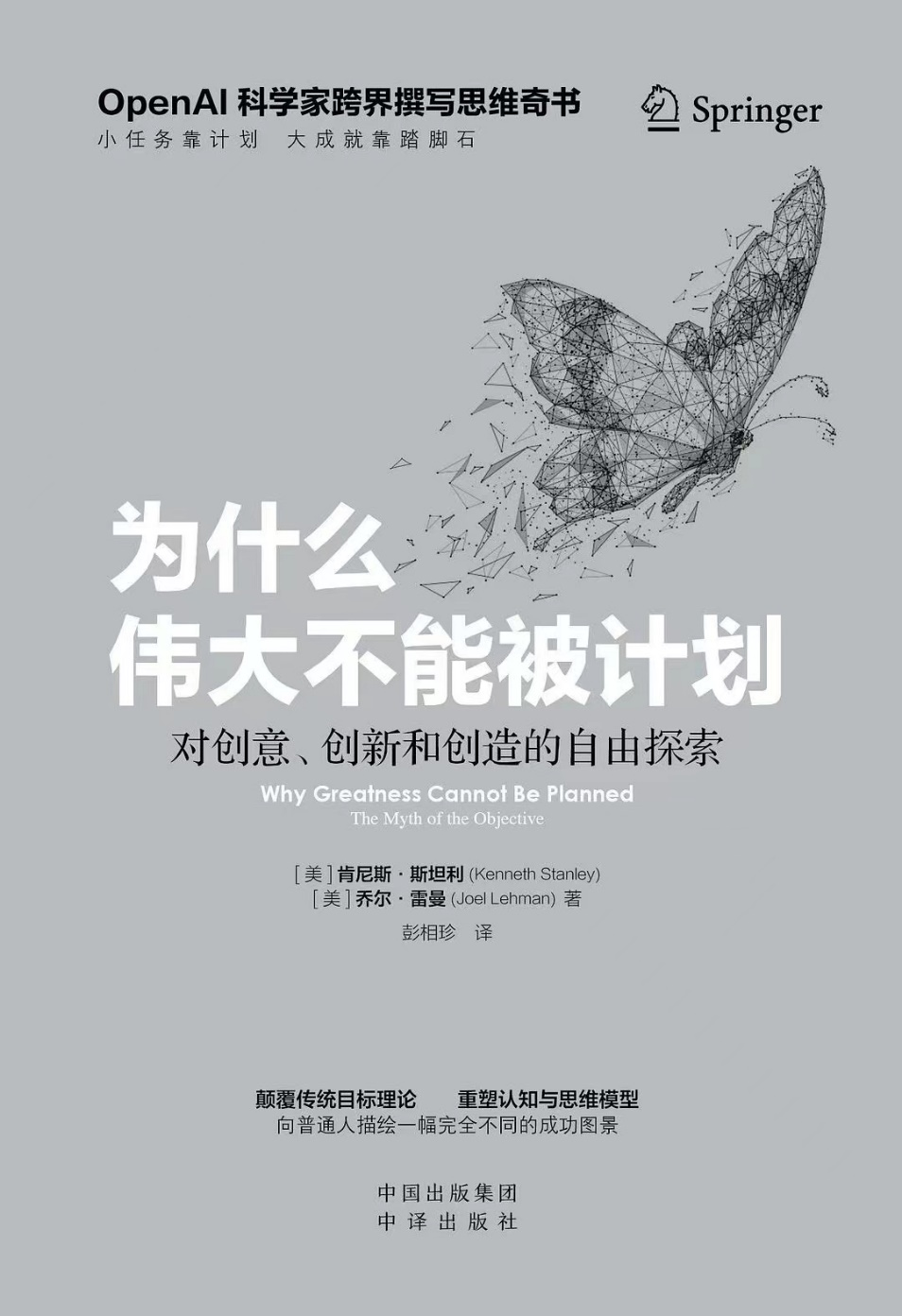 这两位科学家就是肯尼斯·斯坦利(Kenneth Stanley,简称“肯尼斯”)和乔尔·雷曼(Joel Lehman,简称“乔尔”),两位也是《为什么伟大不能被计划》这本关于创新方法论的书的作者。在加入OpenAI之前,二人还都曾在Uber AI实验室工作。