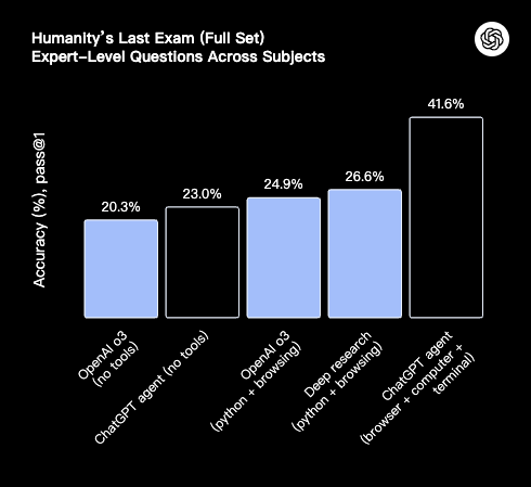 协作与交互性: 它会在必要时自动扣问更多细节以完成目的。用户可以随时停止、重定向使命或完全接受欣赏器的控制权。 安全与权限控制: 安全性是其计划的焦点部门。在实行购买、提交表单、发送邮件或处置惩罚个人信息等具有现实影响的关键操纵前,Agent 会明白哀求用户允许。同时,它被克制实行如金融转账或提供法律发起等高风险使命。OpenAI 还内置了针对“提示注入”等恶意攻击的防护步伐。 二、多项基准测试跑分“破记录”最难的 HLE 到达 41.6%(with tool), 高于刚刚发布的Grok4(with tool)41.0%。 在评估广域知识与专家级提问的 Humanity’s Last Exam 上,单次作答正确率达 41.6%;接纳并行八路推理并选取置信度最高答案后可提拔到 44.4%。