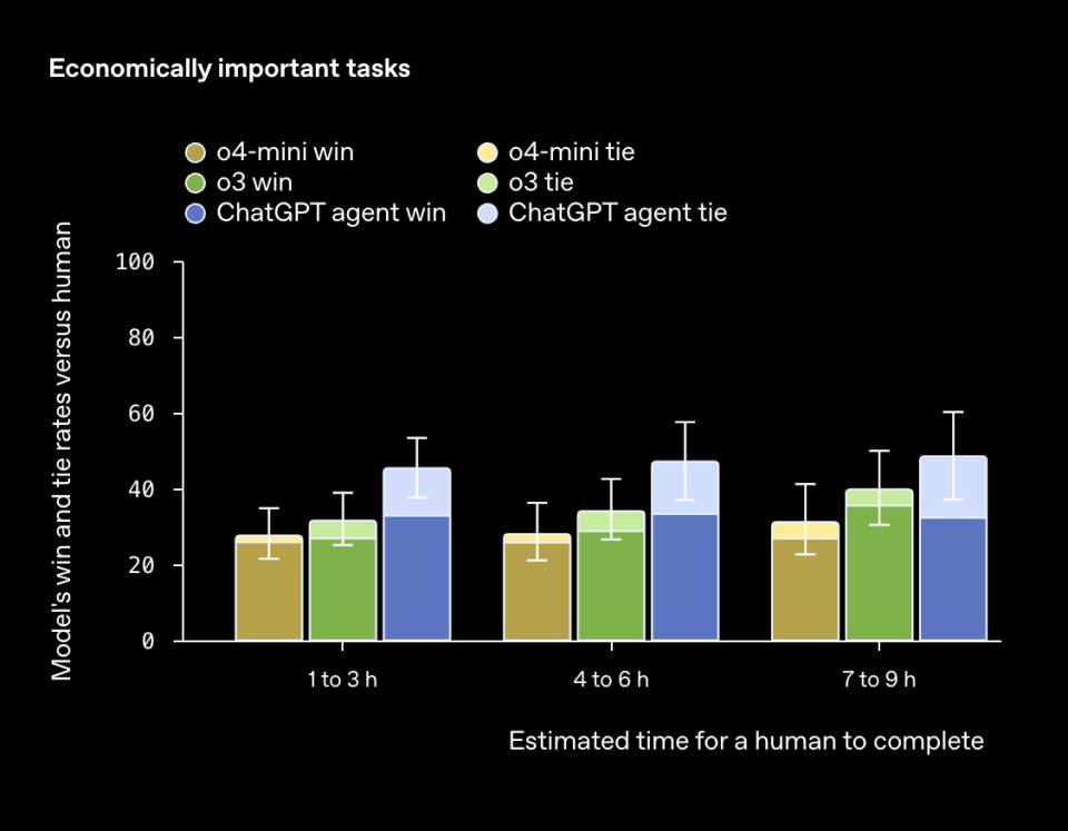 在针对真实知识工作使命的内部评测中,ChatGPT 署理在约半数案例里已与人类持平或更佳;