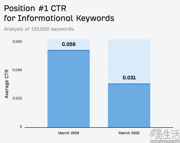 Ahrefs的这一研究效果表现,当搜刮效果中出现AI概览时,相干关键词的均匀点击率会降落34.5%。 详细来说,Ahrefs选取了该公司关键词资源管理器数据库中的30万个关键词,此中有一半触发了AI概览,另一半则未触发。为了确保效果的有用性,Ahrefs特意选取了2024年3月和2025年3月的数据,由于谷歌是在2024年5月举行的I/O开辟者大会上公布的AI概览功能。 通过同比这两个时间点的数据,Ahrefs研究职员发现,触发AI概览的关键词均匀点击率从0.073大幅降落至0.026。