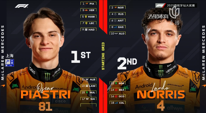 杆位起步到冠军冲线!皮亚斯特里西班牙站霸气封王 北京时间今晚,2025赛季F1西班牙大奖赛结束了正赛争夺!最终,皮亚斯特里再次实现“Pole To Win”,诺里斯紧随其后获得亚军,麦克拉伦顺利包揽冠亚! ![]() 勒克莱尔获得第三名,拉塞尔获得第四名。第五至第十名分别是霍肯伯格、汉密尔顿、哈贾尔、加斯利、阿隆索以及因与拉塞尔发生碰撞被处以10秒罚时的维斯塔潘。值得一提的是,赛后维斯塔潘还被票选为了本场最佳车手。