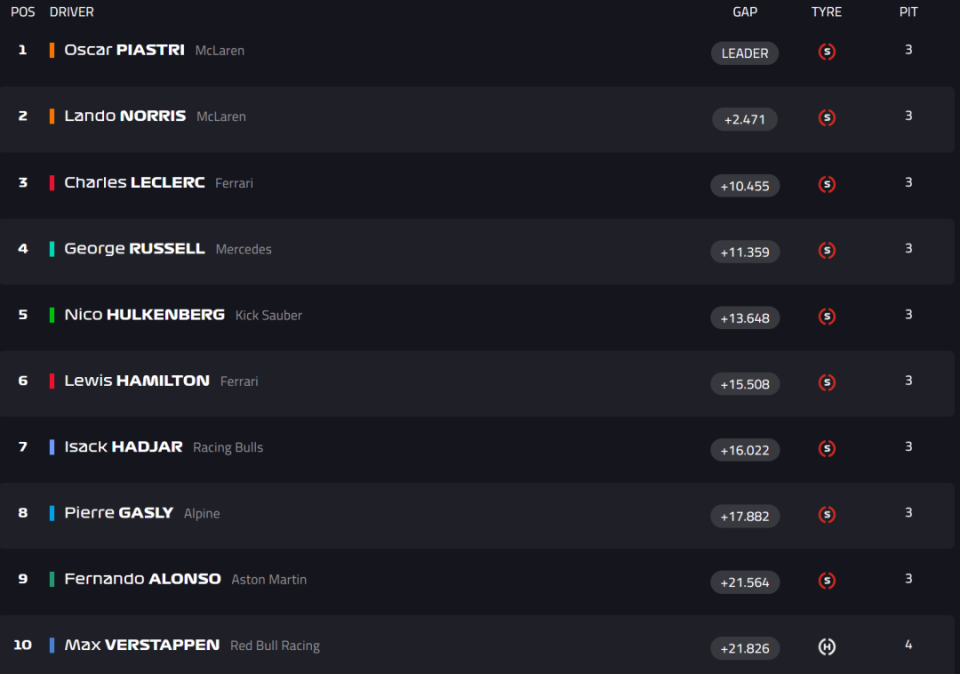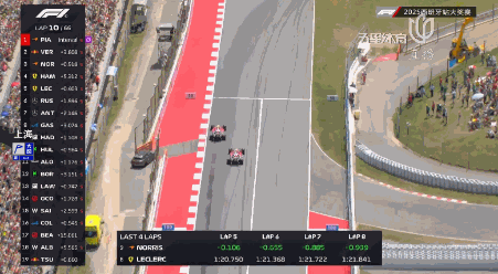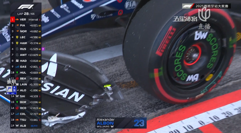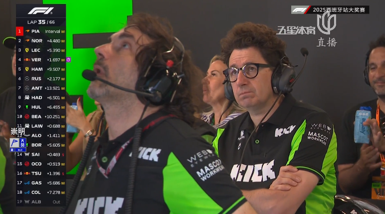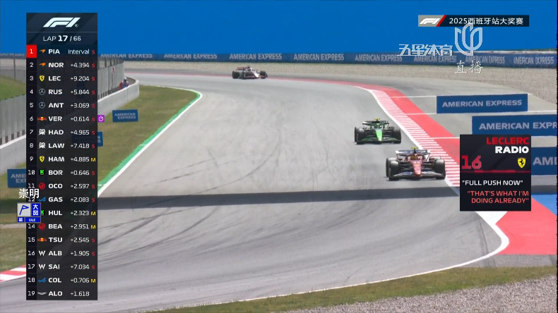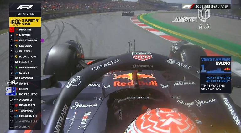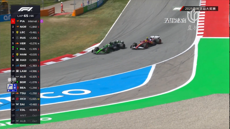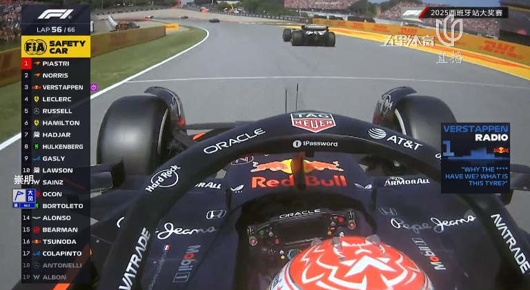 随着西班牙大奖赛正赛的来临,五星体育联手IMAX以及万达影院共同带来的全球首场F1 IMAX影院直播也在今天迎来高潮!现场近200位车迷以及北京、广州、深圳、武汉和成都五个城市的赛车迷,共同见证这一历史性的时刻! ![]() ![]() ![]() 西班牙大奖赛 正赛赛况 2025赛季世界一级方程式锦标赛 ![]() 西班牙站赛道信息 ![]() 西班牙站轮胎配方 加泰罗尼亚赛道今天的气温高达30度,对于车手们而言不仅要与高温对抗,更是对他们的轮胎保护提出了更高的要求!在发车顺位上,斯特罗尔因伤缺席本站比赛,维斯塔潘和拉塞尔Q3成绩相同在第二排发车,前者因率先做出圈速获得第三,麦克拉伦双雄头排发车。 ![]() ![]() 随着五盏红灯熄灭,比赛正式开始!皮亚斯特里守住第一,维斯塔潘的起步相当出色,在进入一号弯时超越诺里斯来到第二,拉塞尔的行进路线被影响,而起步同样出色的勒克莱尔不断提升自己的排名,上升两位后来到汉密尔顿身后位列第五!梅奔双雄起步不佳,拉塞尔掉至第六,安东内利掉至第七。 ![]() 车阵后方,博托莱托和阿尔本的赛车因碰撞受损,霍肯伯格上升四个名次来到第十!阿尔本因鼻翼受损在第8圈进站更换前翼,出站后已经掉至队尾。 随后几圈,现场的视角都集中在法拉利双雄勒克莱尔和汉密尔顿身上!虽然勒克莱尔的单圈速度比汉密尔顿快,但后者始终采取积极的防守。第10圈,汉密尔顿接到车队指令让过勒克莱尔,但此时勒克莱尔已经被诺里斯拉开将近6秒。 ![]() ![]() 第12圈,诺里斯已经追到了维斯塔潘的身后,而后者已经被领跑的皮亚斯特里拉开到4秒以上。第13圈,诺里斯在一号弯前就利用DRS完成超越,但距离身前的队友还有4秒左右的差距。 ![]() 同一圈,劳森利用DRS超越博托莱托进入积分区!而主场作战的“头哥”阿隆索出现失误驶出赛道,损失不少时间。与此同时,维斯塔潘进站换胎实行undercut战术,出站后排在哈贾尔身后位列第八名,并在第16圈完成超越来到第七! ![]() 随后多数车手进站完成换胎,第17圈汉密尔顿进站换胎,耗时2.2秒。出站后卡在博托莱托身前位列第九名,车队通过TR告知汉密尔顿全速推进! ![]() 第18圈,拥有轮胎优势的维斯塔潘超越安东内利来到第五!勒克莱尔同圈进站换胎耗时2.1秒,出站后位列劳森和汉密尔顿身前! 第19圈,第三名的拉塞尔圈速不断变慢,维斯塔潘完成超越之后火力全开!缩小与身前诺里斯的差距! ![]() 第21圈,拉塞尔进站换胎,出站后排在汉密尔顿身后位列第七名!诺里斯同圈进站,换胎出现一些失误耗时3秒,出站后被维斯塔潘翻掉跌至第三名。 第22圈,皮亚斯特里进站,由于本站进站窗口平均耗时在22秒左右,因此他出站之后同样被维斯塔潘翻掉!位置来到第二名。对于现如今的F1比赛而言,明知两辆赛车都将因进站交出领先位置的情况还要安排进站,不得不佩服麦克拉伦的魄力。 ![]() 比赛来到25圈,所有车手都完成了一停。此时前十名的车手中,除了维斯塔潘和加斯利使用软胎之外,所有的车手都是用中性胎。同一圈,阿尔本与劳森在一号弯的对抗中前翼受损,劳森完成超越后升至第十二名,至此阿尔本这一站比赛的两个前翼全部损坏,他没有前翼换了!随后车队告知他退赛...... ![]() ![]() 第30圈,本场比赛的变数来了!维斯塔潘选择进站换上中性胎,出站后他正好压在了汉密尔顿的身前位列第四名!这次进站选择对于时机的把控恰到好处! ![]() 第31圈,汉密尔顿通过TR告知车队自己的赛车后轮始终缺少抓地力,从数据上来看,身后的拉塞尔已不断缩小差距!追到了汉密尔顿身后约1.3秒左右! 第34圈,霍肯伯格已经来到第九名!而博托莱托在这一圈的一号弯利用DRS超越塞恩斯来到第十三名不断逼近积分区!随后镜头给到了P房中的比诺托!“比老师”此刻气定神闲!似乎有好事发生? ![]() 第36圈,手握轮胎优势的维斯塔潘超越勒克莱尔来到第三名! 第41圈,勒克莱尔率先进站,出站后排在拉塞尔身后位列第六,差距在11秒左右。随后一圈,拉塞尔也进站换上红胎,出站后位列队友安东内里身后排在第七名。 第43圈,维斯塔潘不断缩小和身前麦克拉伦双雄的差距,此时距离诺里斯4.3秒左右,而距离皮亚斯特里则在7秒左右。并且, 领先身后汉密尔顿达到20秒,近乎拉开一个进站窗口。 ![]() 第47圈,汉密尔顿进站换胎出现失误耗时5.9秒,出站后瞬间掉到了安东内利身后,本场比赛就此交代了。同一圈,维斯塔潘进站完成三停,出站后虽然落在角田身后,但队友非常懂事立刻让过,维斯塔潘守住第三并没有损失多少时间。 ![]() ![]() 第49圈和第50圈,诺里斯与皮亚斯特里相继进站,后者出站后虽然遭遇慢车,但总体的节奏没有受到什么影响。反倒是诺里斯和维斯塔潘进入慢车堆后碰上了比尔曼和劳森的对抗,损失了不少的时间,但二者的差距始终在1.3秒左右。 ![]() ![]() 维斯塔潘甚至对比尔曼的走线表示了不满 来到第54圈,积分区内的所有赛车基本都完成了自己的进站策略。就当所有人都认为比赛就此失去悬念时,安东内利的赛车在10号弯重刹区冲出赛道驶上砂石地,引发黄旗的同时触发安全车! ![]() 此时,皮亚斯特里和诺里斯以及维斯塔潘立刻进站,诺里斯耗时3.9秒偏慢,维斯塔潘竟然换上了白胎!维斯塔潘随后询问车队为什么要换上硬胎,车队只能无奈的表示这是仅剩的选项了,考虑到白胎在西班牙站的糟糕表现,维斯塔潘显然不满意车队的这个指令! ![]() ![]() “Look in my eyes!Tel