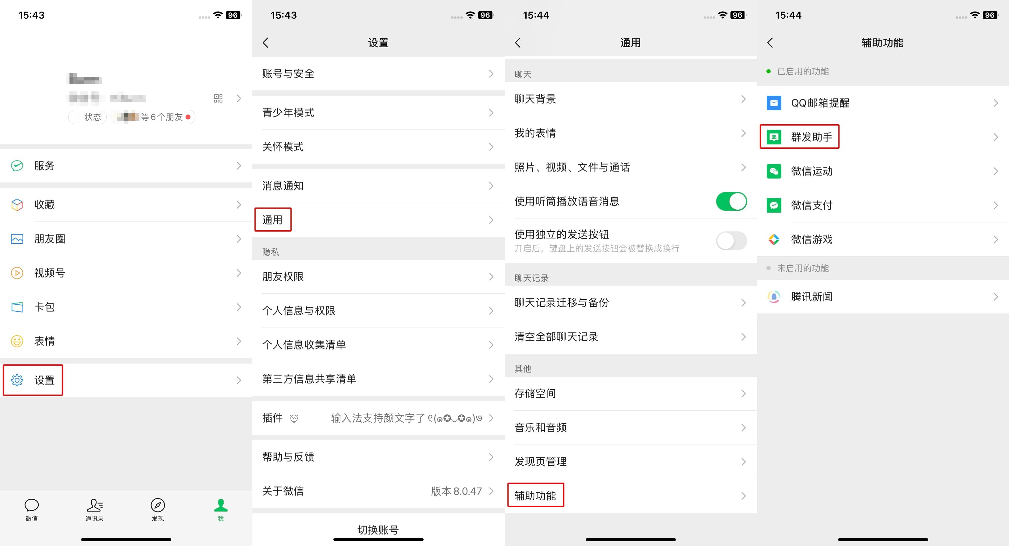打开微信,点击「设置」——「通用」——「辅助功能」——「启用群发助手」。