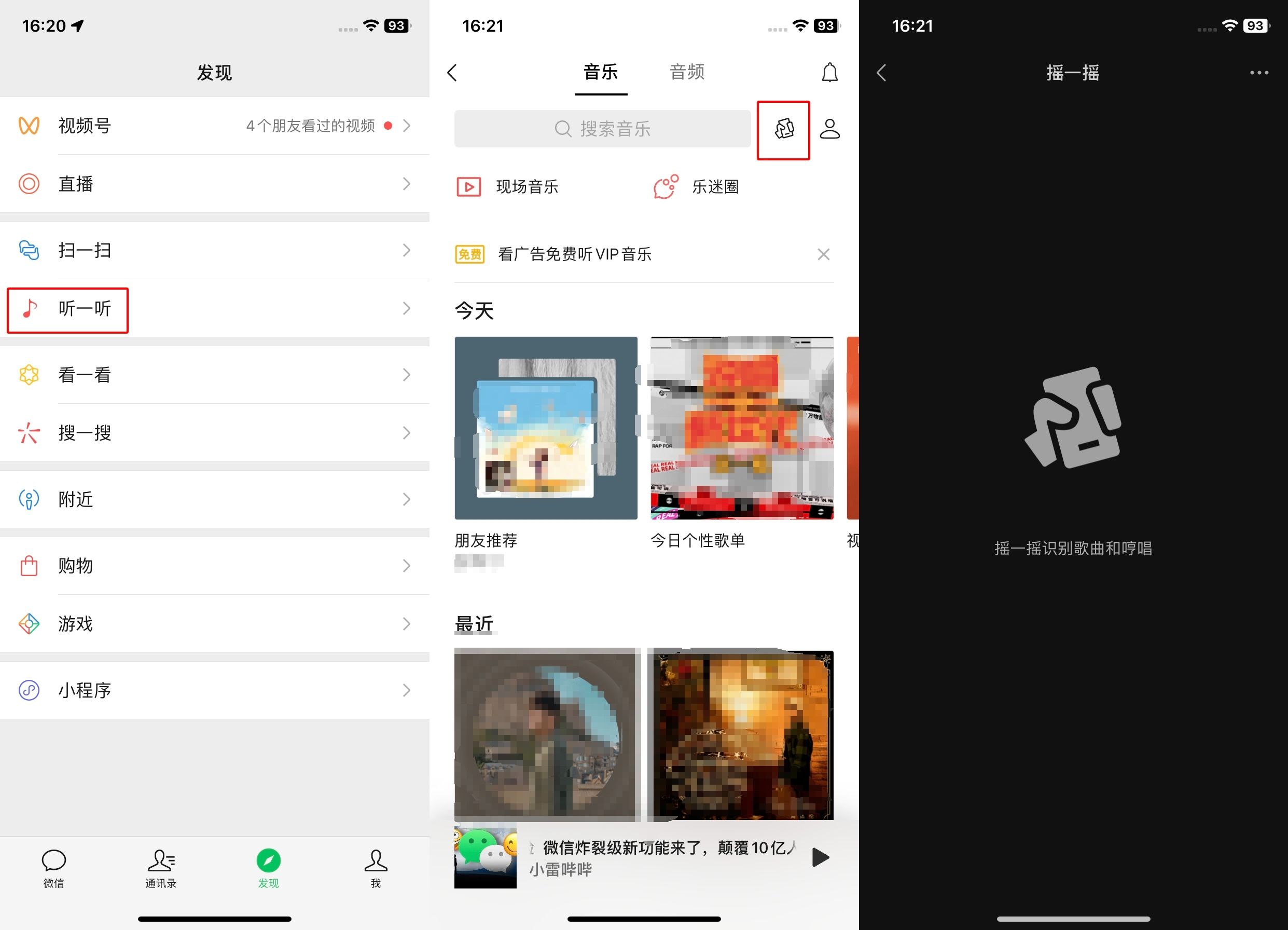 听一听替换了摇一摇的标识,点击进入后音乐右上角才是我们熟悉的摇一摇图标。