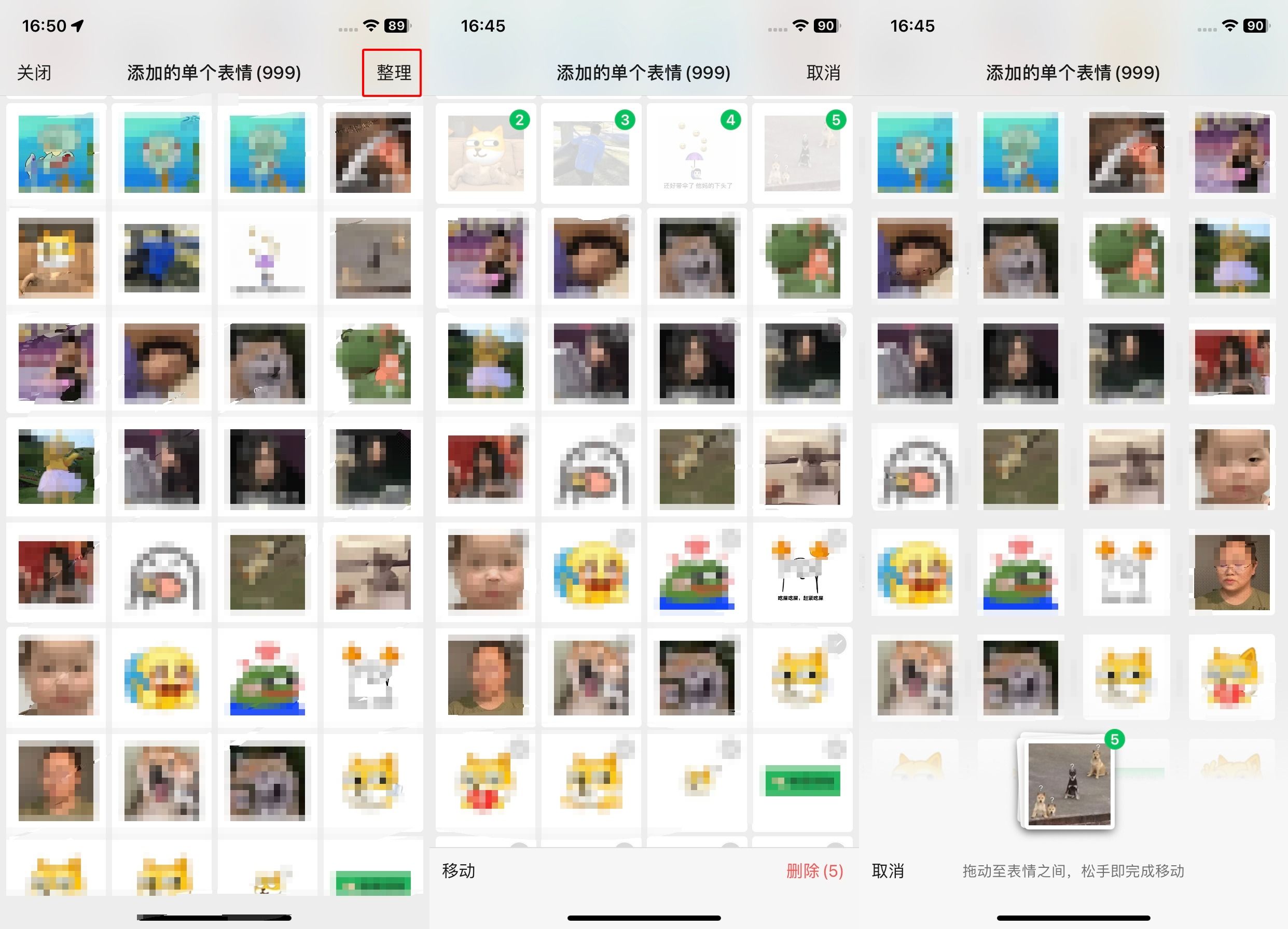 点击右上角「整理」,选择需要移动的表情,再点击左下角「移动」,就可以拖动这些表情松手完成移动了。