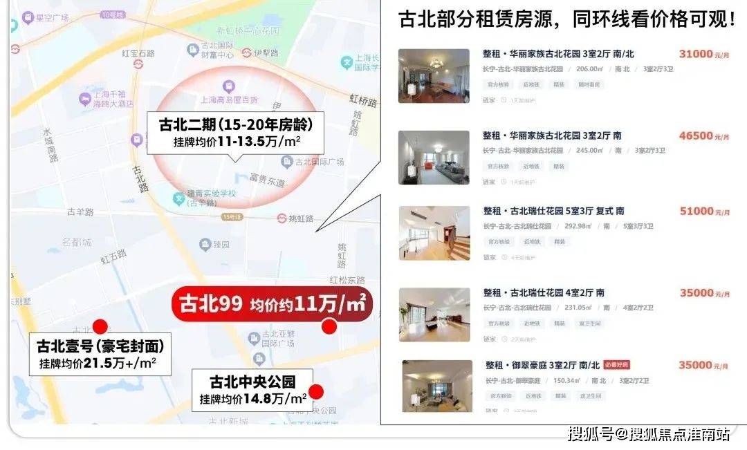 项现在期少量建面约133-154㎡2-3房、少量233-299㎡顶层复式准现房在售 古北的高代价毋庸置疑,坚挺的租售市场最有说服力: 古北二期房龄靠近20年,挂牌代价仍旧能挺在11-13.5万/㎡;古北中心公园挂牌约14.8万/㎡;代价天花板的古北壹号次新居挂牌价约21.5万/㎡。 在倒挂抹平的当下,古北99是市场少有的新居比周边二手自制的项目! 租赁代价同样很可观,像御翠豪庭约150㎡户型月租金约35000元。 坚挺租售市场的背后,是大量想要进入古北的高净值家庭,茂盛的需求与恒久断供形成了严峻的供不应求,大古北已3年断供,古北99是地区3年来首个新居!而且周边地皮开辟殆尽,新居难有增量了。