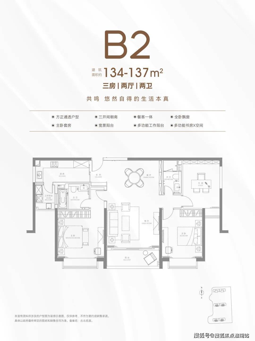 B2户型双卧+客堂朝南,开间标准阔绰。 主卧是套间,满意业主对于私密性的需求。 厨房和X空间也有南向采光,此中X空间可随家庭布局变革机动变革,可以是寝室、开放式书房、电竞区、儿童阅读,乃至女王化装间等。 别的,全卧飘窗,进一步延展了室内利用空间。