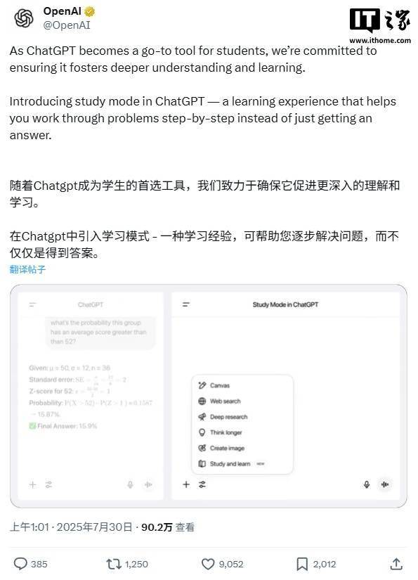 IT之家 7 月 30 日消息,本日破晓,OpenAI 公布推出 ChatGPT 的 Study 学习模式,旨在资助门生真正把握知识点,而不但仅只是完成作业。 从本日起,该功能对免费、Plus、Pro、Team 用户开放,而 ChatGPT Edu 版用户还必要再等几周。