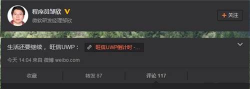 客岁,UWP版手机淘宝上架。如今又有一个好消息传来,WP用户终于盼来了一个阿里系APP。克日,微软研发司理在微博公布,旺信UWP版已经进入倒计时,现在处于测试阶段,不久将发布。
