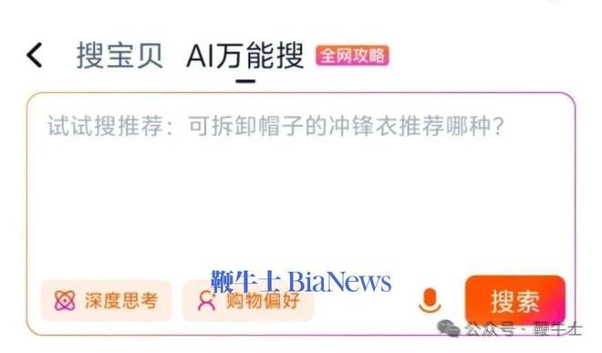 6、淘宝灰测「AI全能搜」新功能 8月19日,鞭牛士在淘宝搜刮页面发现,淘宝正在灰度测试“AI全能搜”新功能。 颠末测试发现,AI全能搜可以结适用户的购物偏好举行深度思索,并给出购物发起。