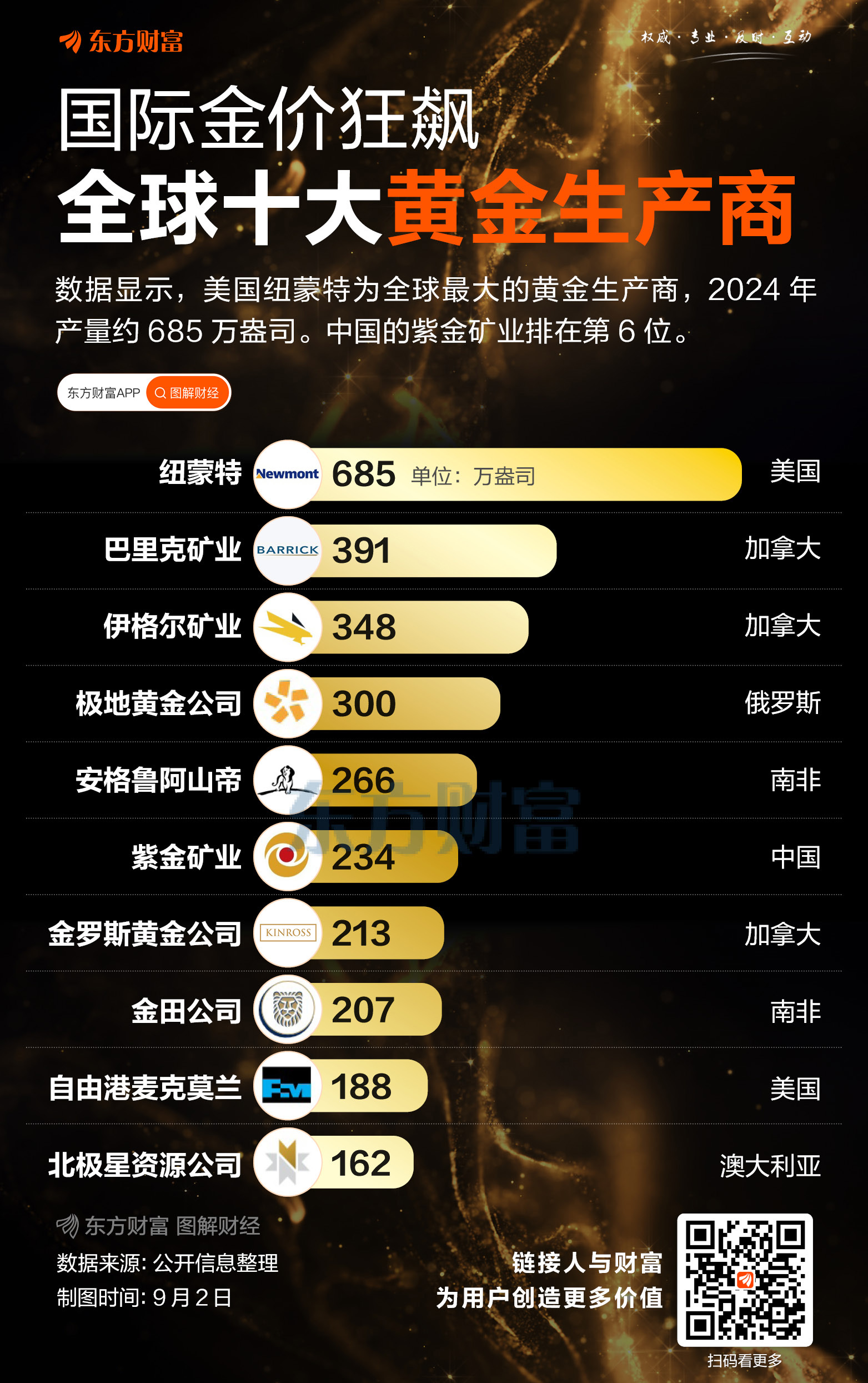 在东方财产看资讯行情,选东方财产证券一站式开户生意业务 ![]() 近期国际金价再次上扬,COMEX黄金再创汗青新高,一度触及3578.4美元/盎司。受此影响,A股贵金属板块体现强势,西部黄金2连板,湖南白银、晓程科技、中金黄金、四川黄金等跟涨。 对于当下金价的走强,中信期货以为重要来自于两方面的影响:一是市场对美联储9月重启降息周期的预期升温。CME FedWatch工具最新表现,美联储9月降息25个基点的概率已靠近九成。二是特朗普公布开除美联储理事莉萨·库克,引发市场对美联储独立性的担心,进一步放大贵金属的避险吸引力。 别的,中国黄金协会发布的《环球黄金年鉴2025》表现,官方部分购金净需求量已一连三年突破千吨大关。业内人士以为,这也在肯定水平上提振了金价。 今后看,不少机构对金价表现乐观。好比美国银行维持2026年上半年金价升至4000美元的观点。摩根大通也预计,2026年初金价或到达4000美元。 而在金价一起上扬之际,哪些公司是“产金大户”,就成了投资者关注的核心。统计数据表现,美国的纽蒙特是环球第一大黄金生产商,2024年黄金产量约为685万盎司。加拿大的巴里克矿业和伊格尔矿业位列二三位,2024年分别生产黄金391万盎司和348万盎司。中国的紫金矿业位列环球第6位,2024年黄金产量约234万盎司。金罗斯黄金、金田、自由港麦克莫兰也位列环球前十大黄金生产商之列。