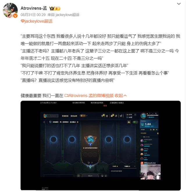 就连JKL本身都无奈表现,本身身上的伤病着实太多了,来岁还打不打职业本身也不清晰,之后纵然继承打职业大概也打不了几年,用阿水本身的原话来说就是他“还想多活几年”。对于一位从2016年开始职业生活,至今已经打了9年职业的宿将而言,确实可以想象阿水身上的伤病不容乐观。