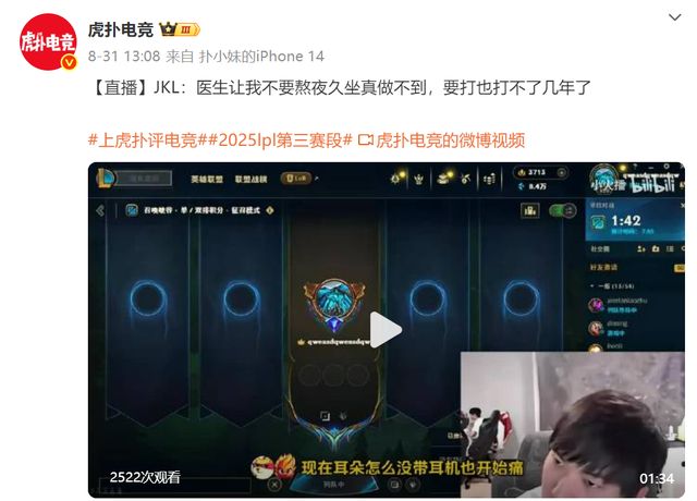 而作为一位已经在电竞圈打拼了长达九年时间的宿将,Jackeylove在竣事组内赛的漫长赛程事后,于克日久违开播并分享了关于本身的现状。面临弹幕粉丝们的关心,JKL也坦言本身的职业生活大概已经打不了几年,乃至由于十年如一日高强度的练习与角逐,也导致JKL本身满身上下都是病。