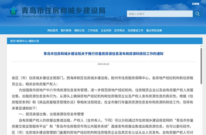 为增强我市房地产中介市场房源信息发布管理,进一步规范房地产经纪机构、住房租赁企业以及自有房屋产权人房屋出售、出租房源信息发布举动,从源头上确保房地产经纪机构和住房租赁企业及产权人发布房源信息的真实性,日前,青岛市住房和城乡建立局发布《关于推行存量房房源信息发布和房源码核验工作的关照》(以下简称《关照》),在全市推行存量房房源信息发布和房源码核验工作。